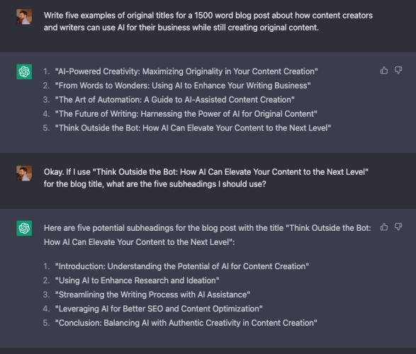 And, as you can see from the example, I can go from a title I like to creating subheadings for the post. Again, none of the subheadings are usable as-is. But they help me see the structure and content that ChatGPT sees from other content. Now I know what sub-topics matter to searchers and how readers might expect my article to be organized. That’s not only a way to optimize the piece of content you’re writing, but it also provides some valuable audience research that helps you better understand the people you’re writing for.